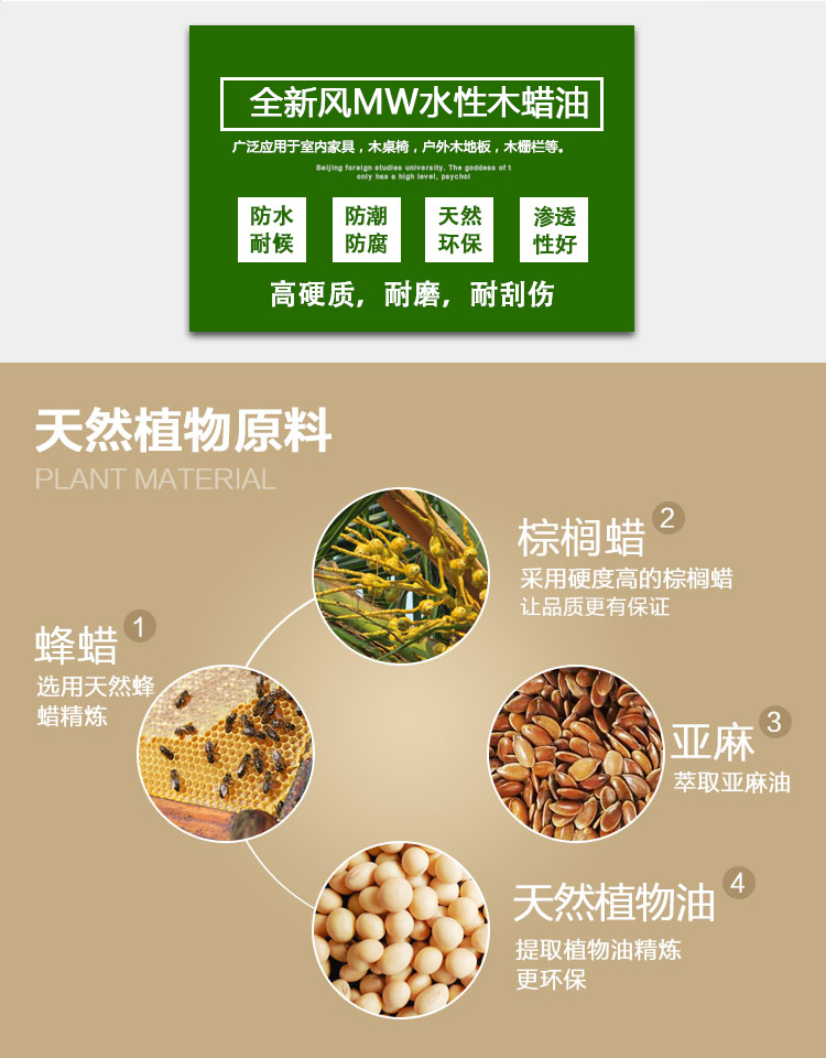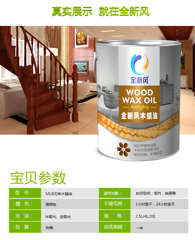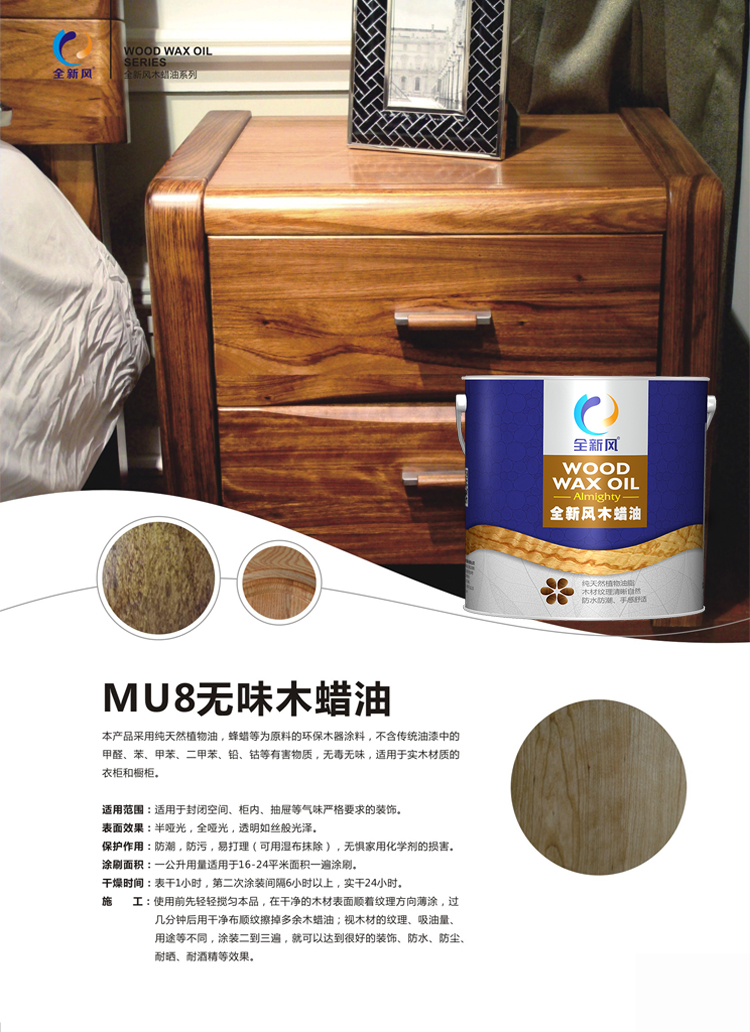 采用纯天然植物油脂,蜂蜡等为原料的环保木器涂料,不含传统油漆中的甲醛、苯、甲苯、二甲苯、铅、砷、钴等有害物质,无毒无味,适用于实木材质的衣柜和橱柜。