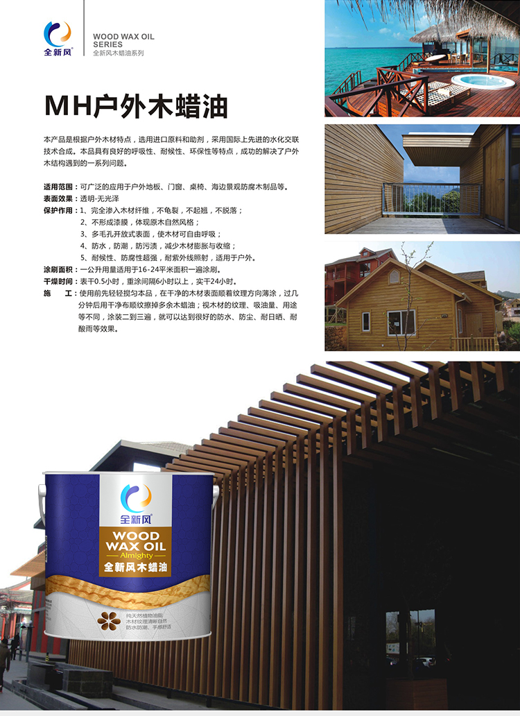 本产品是根据户外木材特点,选用进口原料和助剂,采用国际上先进的水化交联技术合成。本品具有良好的呼吸性、耐候性、环保性等特点,成功的解决了户外木结构遇到的一系列问题。