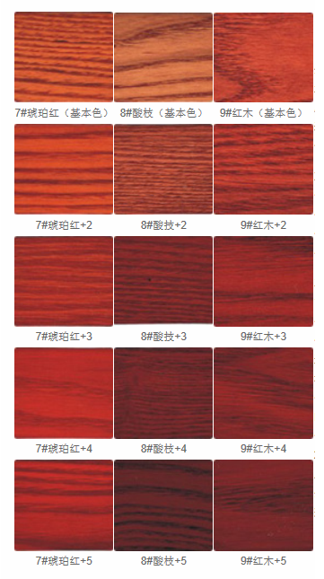 本品适合在木器漆上着色,选用进口优质颜料及染料,采用高浓度配方精制而成。色彩均匀饱满,清新亮丽,任何材质面板均可适合,起到充分放大木纹木眼的美感作用,从而形成纹理分明,色泽鲜艳的对比效果,让人有不同的立体感受。