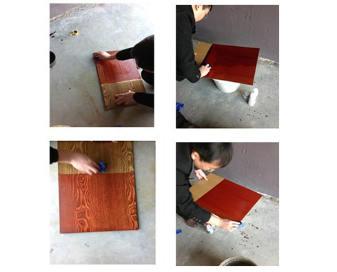 用湿毛巾擦去面漆上灰尘,待水干后用擦色宝涂刷在漆膜上,30分钟后用沾水拧干棉布沿木材纹路擦除,即可拥有清晰自然的色彩效果。