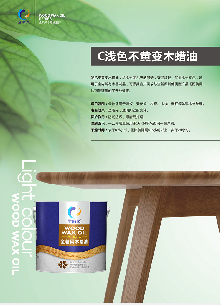 浅色不黄变木蜡油,给木材婴儿般的呵护,突显纹理,尽显木材本色,适用于室内所有木器制品,可根据客户需求与全新风其他类型产品搭配使用,达到最理想的半开放效果。